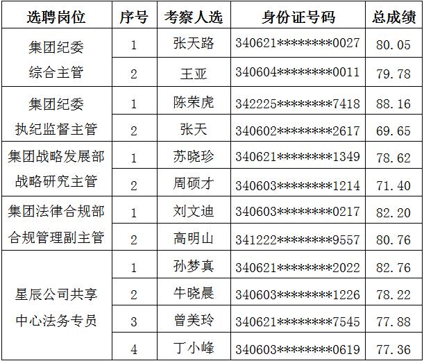 淮海實業(yè)集團招聘筆試、面試工作已結束,根據(jù)應聘人員筆試、面試總成績確定考察人選,現(xiàn)將考察人選公告如下: