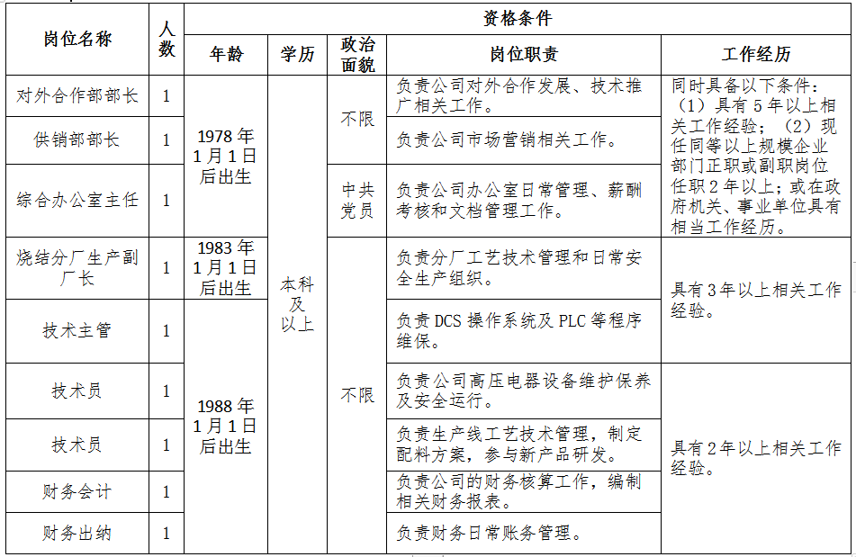本次招聘9個崗位(見下表)?;春崢I(yè)集團在崗人員參加報名的,其資格條件按照《集團公司管理和專業(yè)技術崗位管理辦法》第十二條的第三、四、五款執(zhí)行。其他人員報名按以下資格條件執(zhí)行。