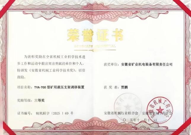 2025年度安徽省機械工業(yè)科學(xué)技術(shù)獎獲獎名單日前正式公布。安徽礦機自主研發(fā)的“TYA-700型礦用液壓支架調(diào)移裝置”成功斬獲三等獎!