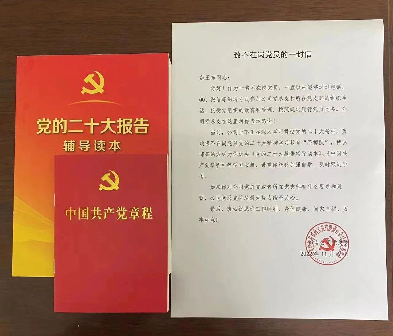 該公司黨總支分別走訪3位黨員,贈與《黨的二十大報告輔導讀本》、《中國共產(chǎn)黨章程》等學習材料,并通過話發(fā)展、談變化,深入學習領(lǐng)會黨的二十大提出的新思想、新理論,作出的新部署、新要求,切實把思想和行動迅速統(tǒng)一到黨的二十大精神上來。大家紛紛表示,要深刻認識和把握此次大會的精髓實質(zhì),履行好新時代新征程的使命任務,推動黨的二十大精神在基層落地生根、開花結(jié)果。此外,該黨總支還制作致不在崗黨員一封信,聽取不在崗黨員對工作的意見和建議,鼓勵他們?yōu)楣景l(fā)展建設“支招”、出力。