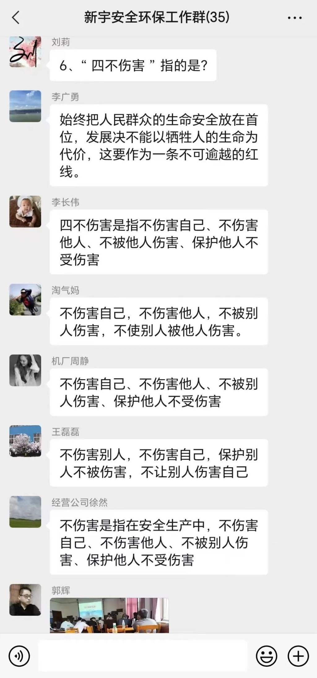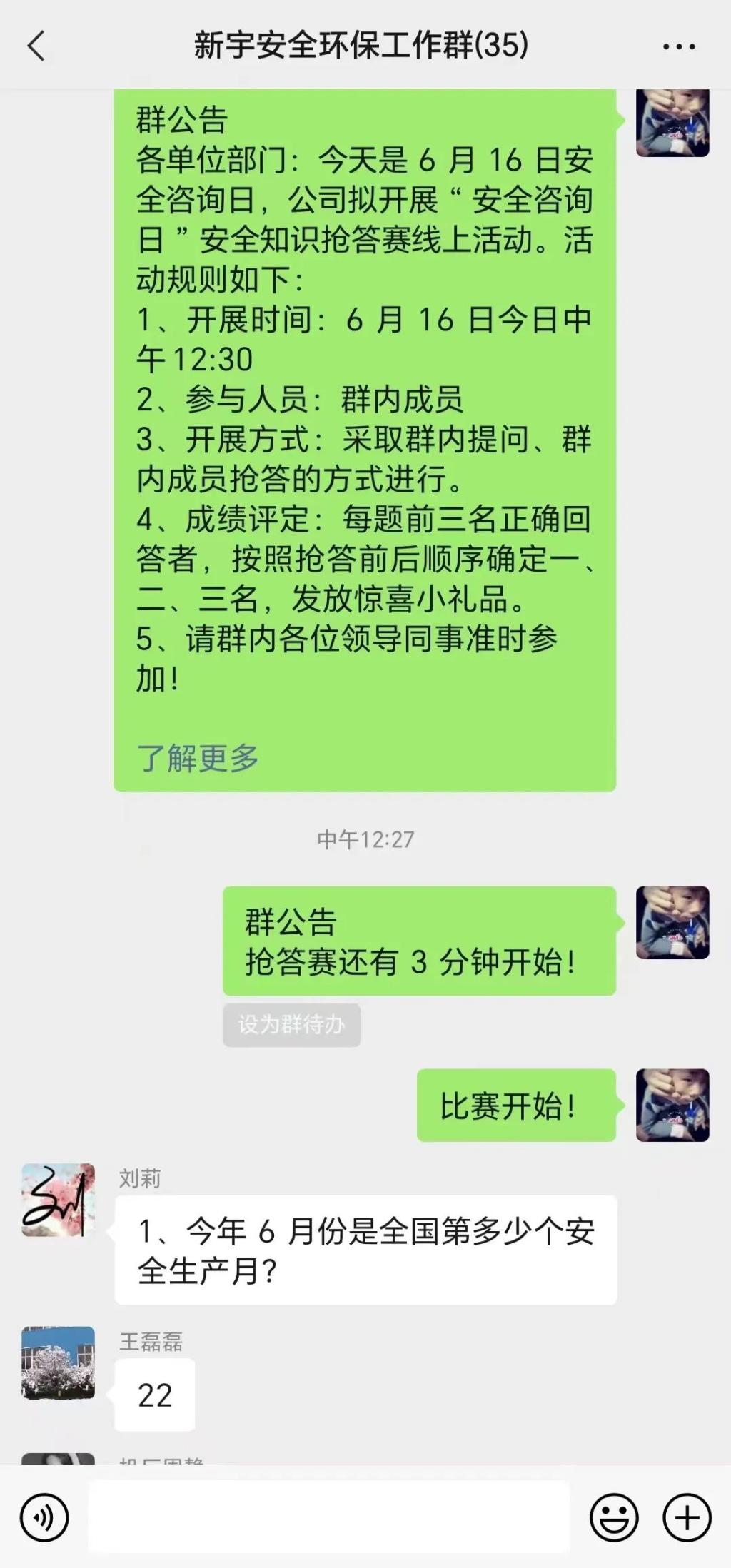 新宇公司創(chuàng)新活動形式,采取與職工線上互動問答的形式,開展安全知識問答,推動職工學(xué)習(xí)安全知識,形式新穎,趣味十足,吸引廣大干部職工踴躍參與。問答內(nèi)容包含安全生產(chǎn)月、防災(zāi)減災(zāi)法律法規(guī)、應(yīng)急管理、技能,引導(dǎo)廣大干部職工牢固樹立安全發(fā)展理念,嚴(yán)格落實安全生產(chǎn)主體責(zé)任,倡導(dǎo)安全文化,積極營造“我要安全、我會安全、我能安全”的濃厚安全氛圍。