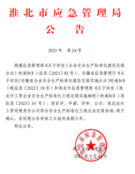筆者了解到,運(yùn)興公司順利通過(guò)淮北市應(yīng)急管理局“安全生產(chǎn)標(biāo)準(zhǔn)化三級(jí)企業(yè)”評(píng)審驗(yàn)收。
