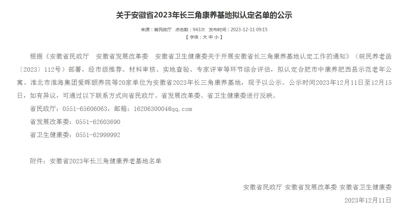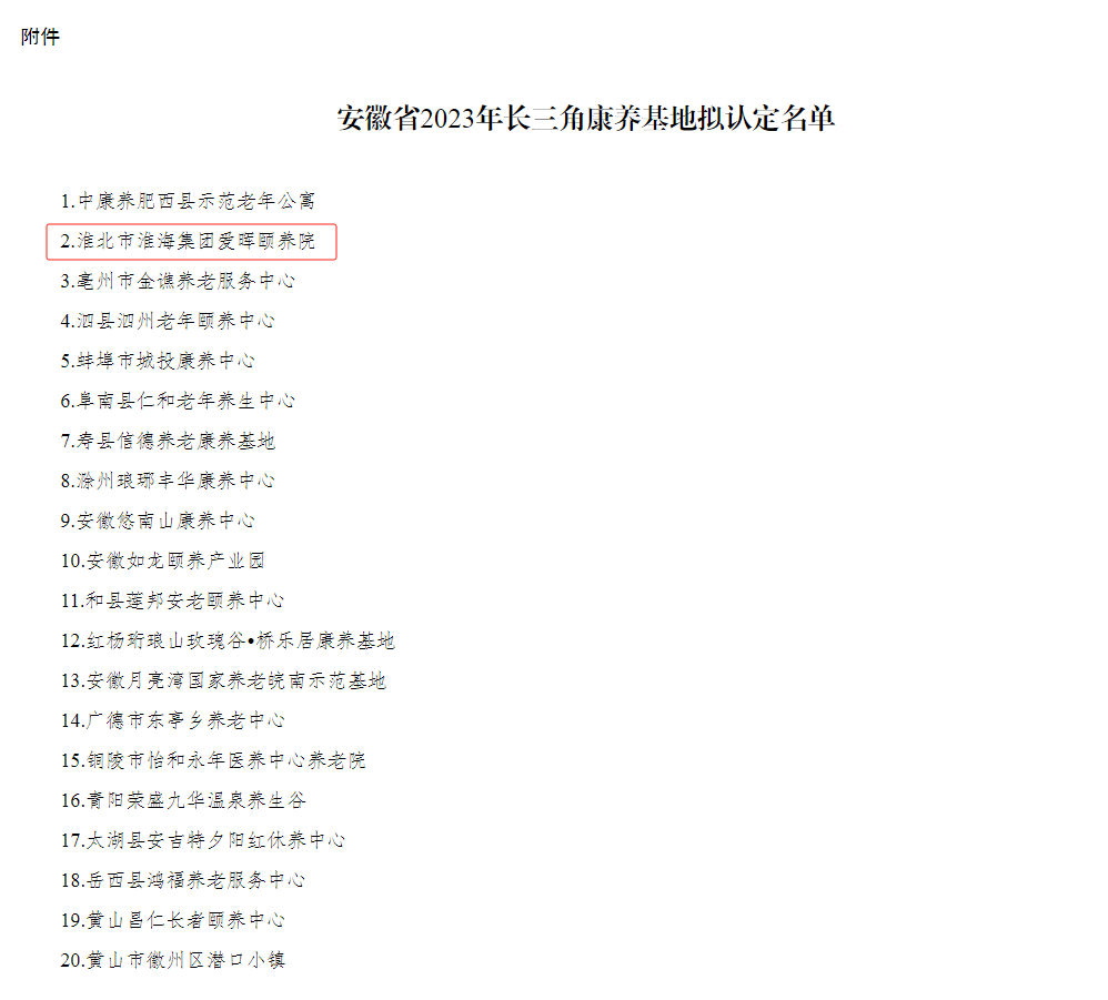 近日,相王現(xiàn)代所屬愛暉頤養(yǎng)院成功被安徽省民政廳認定為“2023年長三角康養(yǎng)基地”。