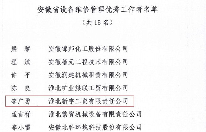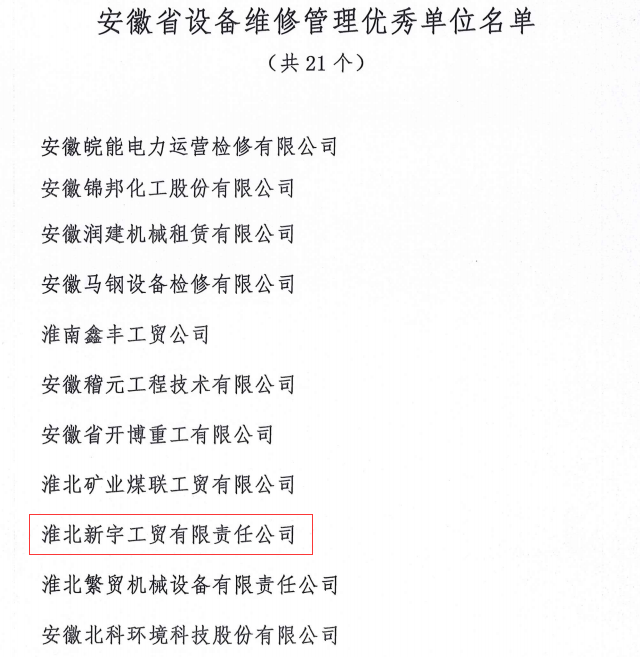 近日,新宇公司被安徽省設備管理協(xié)會評為第十二屆“安徽省設備維修管理優(yōu)秀單位”,所屬中選公司副經理被評為“安徽省設備維修管理優(yōu)秀工作者”。