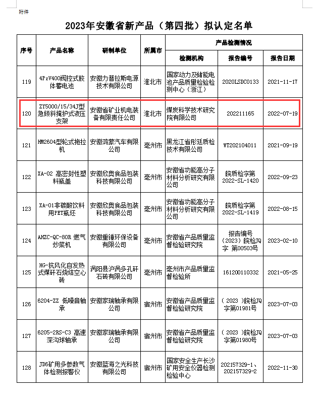 1月29日,安徽省經(jīng)濟和信息化廳下發(fā)安徽省新產(chǎn)品(2023年第四批)名單,安徽礦機產(chǎn)品“ZY5000/15/34J型急傾斜掩護(hù)式液壓支架”成功入選,標(biāo)志著安徽礦機的創(chuàng)新能力邁上一個新臺階。