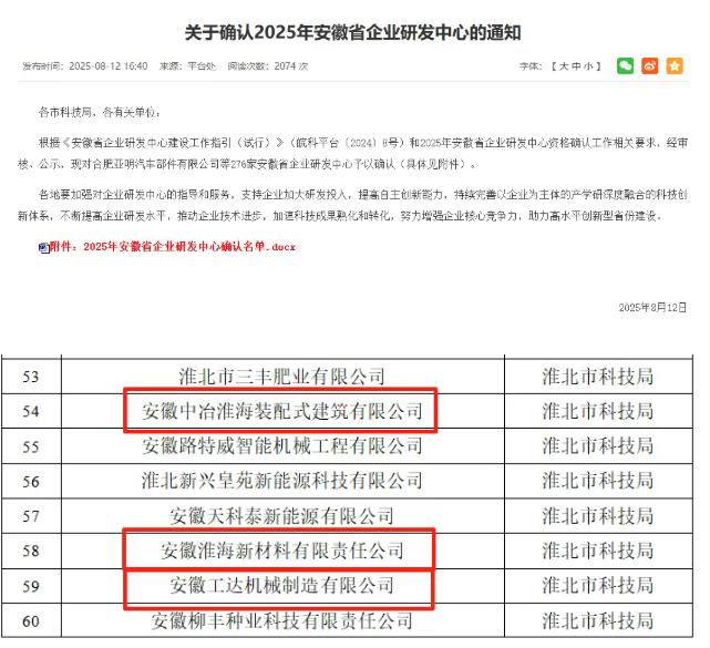 安徽省科技廳近日正式公布2025年安徽省企業(yè)研發(fā)中心認(rèn)定名單。淮海實(shí)業(yè)集團(tuán)旗下安徽中冶淮海裝配式建筑有限公司、安徽淮海新材料有限責(zé)任公司、安徽工達(dá)機(jī)械制造有限公司企業(yè)研發(fā)中心成功入選。這不僅是對(duì)企業(yè)研發(fā)實(shí)力與創(chuàng)新成效的權(quán)威認(rèn)可,更標(biāo)志著集團(tuán)在構(gòu)建高水平創(chuàng)新平臺(tái)體系、提升核心競爭力方面又邁出了堅(jiān)實(shí)一步。