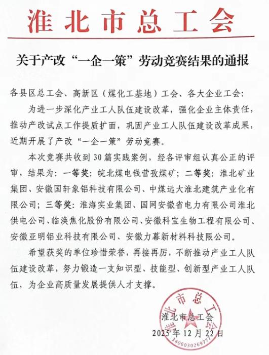 12月22日,淮北市總工會發(fā)布通報,淮海實業(yè)集團工會在產(chǎn)業(yè)工人隊伍建設(shè)改革“一企一策”勞動競賽中榮獲三等獎,集團產(chǎn)改工作再獲認(rèn)可。