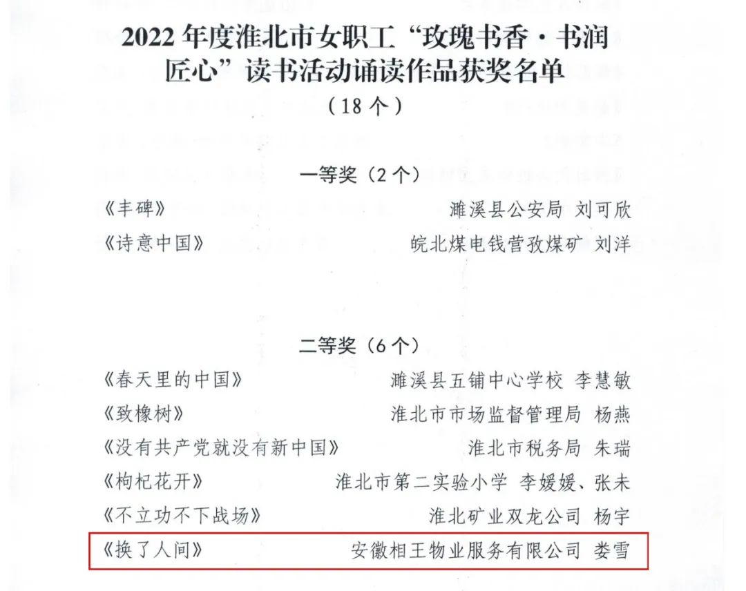 近日,淮北市總工會(huì)通報(bào)表彰了2022年度淮北市女職工“玫瑰書(shū)香?水潤(rùn)匠心”讀書(shū)活動(dòng),淮海實(shí)業(yè)集團(tuán)工會(huì)榮獲優(yōu)秀組織獎(jiǎng),相王現(xiàn)代公司婁雪誦讀作品《換了人間》榮獲讀書(shū)活動(dòng)二等獎(jiǎng)。
