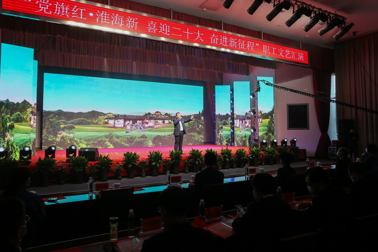 匯演在一曲慷慨激昂的舞蹈《盛世歡歌》中拉開序幕。整場匯演以“喜迎二十大 奮進(jìn)新征程”為主題,唱響禮贊百年風(fēng)華、奮斗嶄新時代的歌伴舞《領(lǐng)航》;以及歌曲聯(lián)唱《紅歌獻(xiàn)給偉大的黨》《映山紅》《向往》……舞臺上,一個個精心編排的節(jié)目,用歌聲、舞蹈、朗誦、器樂演奏、曲藝等形式展現(xiàn)出“淮海人”的文化素養(yǎng);一首首激勵著一代又一代中國人奮發(fā)圖強、創(chuàng)業(yè)開拓的經(jīng)典之歌,在為黨的二十大獻(xiàn)禮的舞臺上輪番唱響。