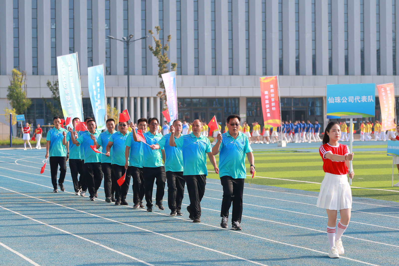 7:30分,伴隨著《歡迎進(jìn)行曲》音樂聲響起,運(yùn)動(dòng)會(huì)開幕式拉開帷幕。國旗隊(duì)率先入場(chǎng),隨后集團(tuán)公司旗幟隊(duì)、裁判員隊(duì)伍、運(yùn)動(dòng)員代表隊(duì)、演出人員隊(duì)伍邁著矯健的步伐依次入場(chǎng)。