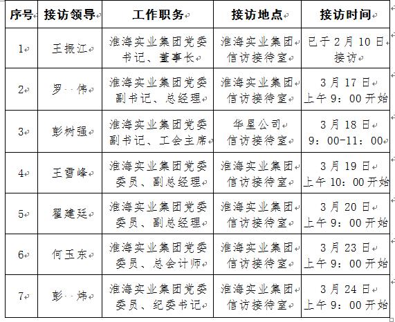 根據(jù)工作安排,現(xiàn)就淮海實(shí)業(yè)集團(tuán)黨委領(lǐng)導(dǎo)班子成員2026年一季度接待職工群眾來(lái)訪安排公示如下:
